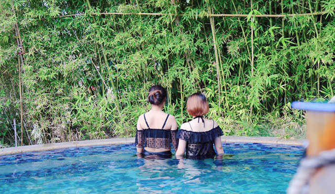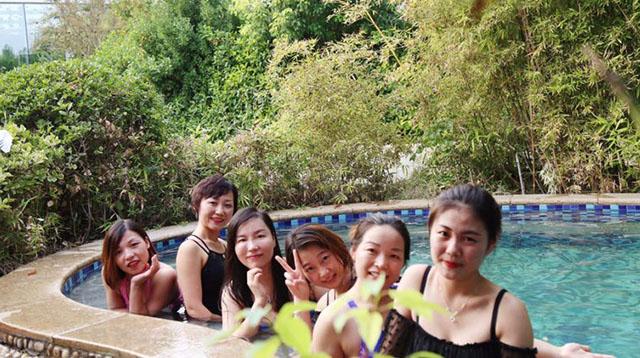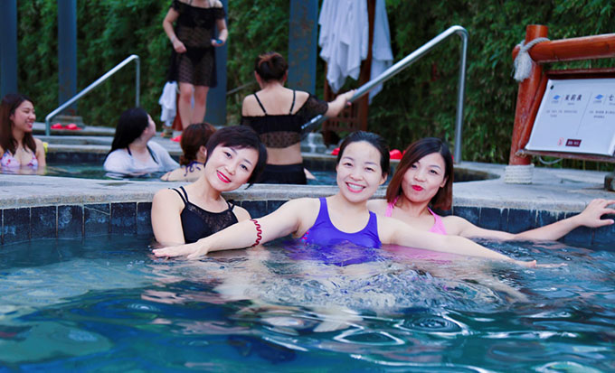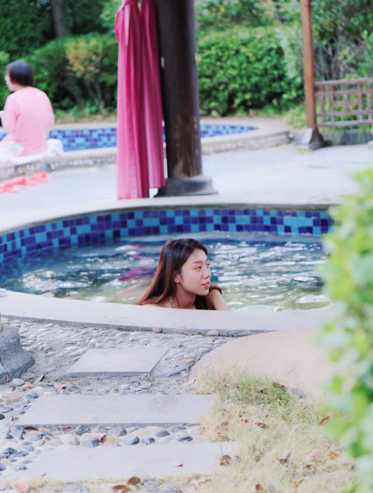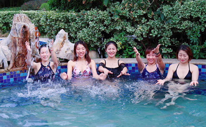 水雾氤氲,泉涌自然。老师们三三两两沐浴在各种花卉灵草温泉池中,在天地眷顾的地方,放逐身心,悄悄秀出青春。